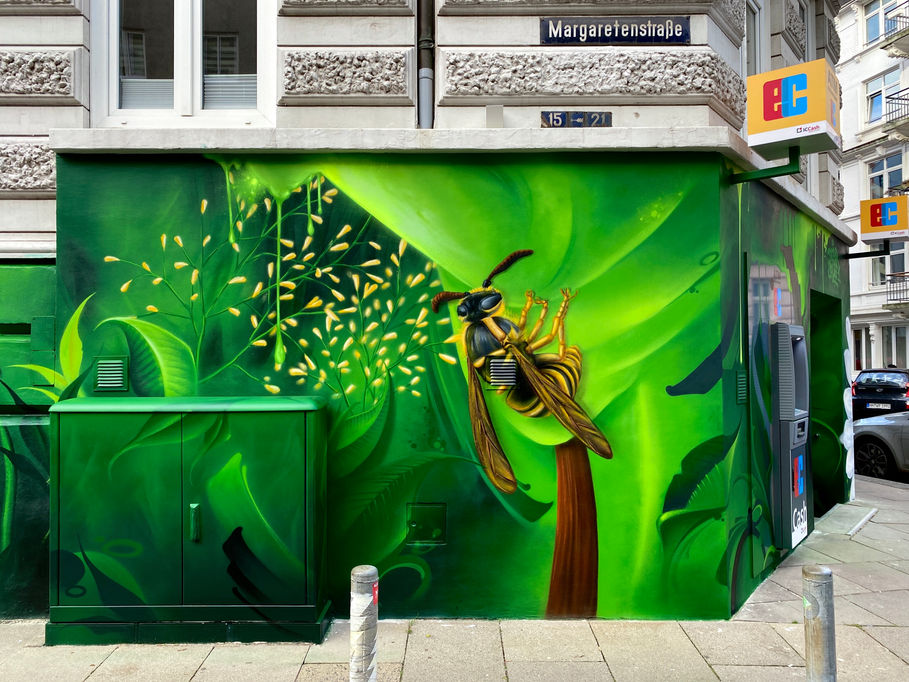Eine Biene auf der linken Seite der Fassade und eine Sonnenblume auf der rechten Seite werden durch fließende Blätter und organische Formen miteinander verbunden. Das Motiv schafft eine harmonische, lebendige Verbindung zwischen Architektur und Natur.
